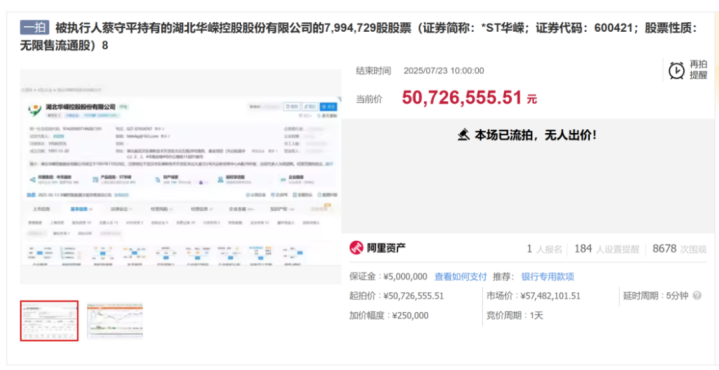 7月24日,*ST华嵘公告上述股权拍卖已结束,标的因在规定时间内无人出价已流拍。*ST华嵘称,本次被拍卖的标的后续是否再次被拍卖具有不确定性。