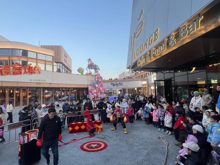 夜幕还未降临,蓝色港湾商圈早已被灯光点亮,亮马河畔树木上缠绕的灯串如星河垂落,商圈楼体被装饰灯光照亮。“下班直奔这里跨年!感受灯光秀的氛围。”张女士和好友在铜球广场上拍照,道路两边亮起的灯光和亮眼灯光装置也成了游客拍照最美的背景板。以“福禄寿喜财”为主题的六只剪纸瑞兽散落在商圈各个角落,寄托美好新年祝愿。